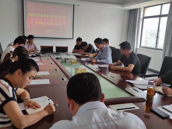 為切實(shí)做好節(jié)日前后安全防范工作,嚴(yán)防各類(lèi)事故發(fā)生,9月26日上午,綜交新型路面材料公司組織召開(kāi)中秋、國(guó)慶節(jié)前安全生產(chǎn)會(huì),董事長(zhǎng)張健、副總經(jīng)理湯建東、總經(jīng)理助理丁愛(ài)學(xué)及公司各部門(mén)相關(guān)人員參加會(huì)議,會(huì)議由總經(jīng)理章偉主持。