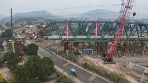 11月27日,由銅陵江北港鐵路專用線公司負(fù)責(zé)建設(shè)的銅陵江北港鐵路專用線項目橫埠特大橋80米有砟軌道簡支鋼桁梁成功頂推到位,這也是江北港鐵路專用線項目全線最長的鋼桁梁。